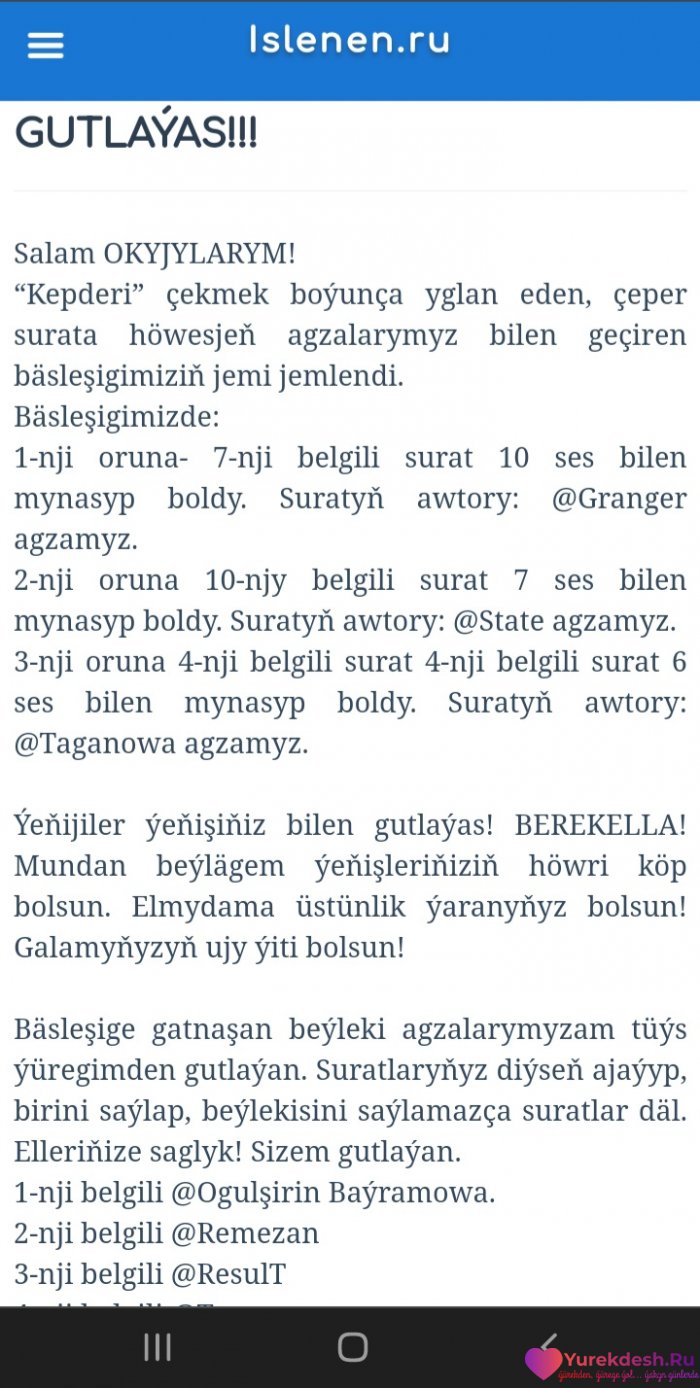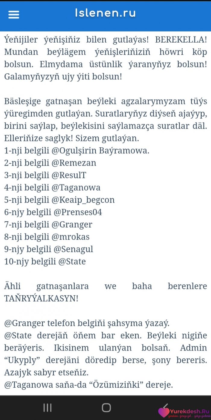 Tuweleme. Ay bul-a Nesilde cap bolandyr...Yaslygymyn baharyna gatnasmansynyz-la, agam. Yeke gitmeli boldum )...dowamy...