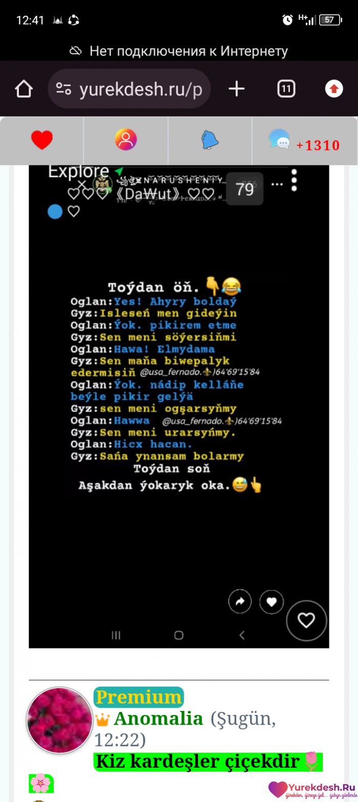 Ey, telefon, telefon, Sen gojaÿyn, sen shasyñ. Hic kim ullanmasa yoren bir gedaÿsyñ. Sen hemma gerek, Çaga~da, ula~da! Sen sebäpli kä gyzla...dowamy...