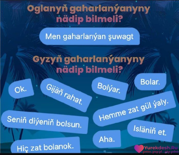 Tuweleme. Ay bul-a Nesilde cap bolandyr...Yaslygymyn baharyna gatnasmansynyz-la, agam. Yeke gitmeli boldum )...dowamy...